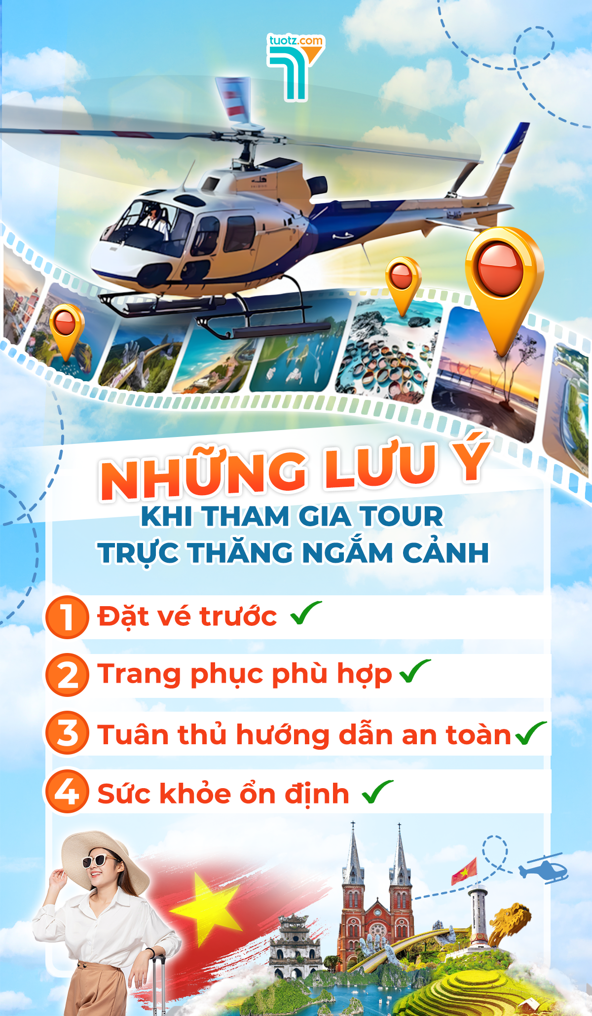 Trải nghiệm tour trực thăng ngắm cảnh từ trên cao là cách hoàn hảo để chiêm ngưỡng vẻ đẹp hùng vĩ của thiên nhiên và những danh thắng nổi tiếng từ một góc nhìn hoàn toàn mới. Bay lơ lửng giữa bầu trời, du khách sẽ được thu trọn vào tầm mắt cánh đồng lúa vàng rực rỡ, dòng sông uốn lượn, những dãy núi trập trùng hay các di tích lịch sử nổi bật. Đây không chỉ là một hành trình du lịch, mà còn là trải nghiệm mạo hiểm, sang trọng và khó quên, mang đến cảm giác tự do và phấn khích khi ngắm nhìn cả vùng đất từ trên cao.